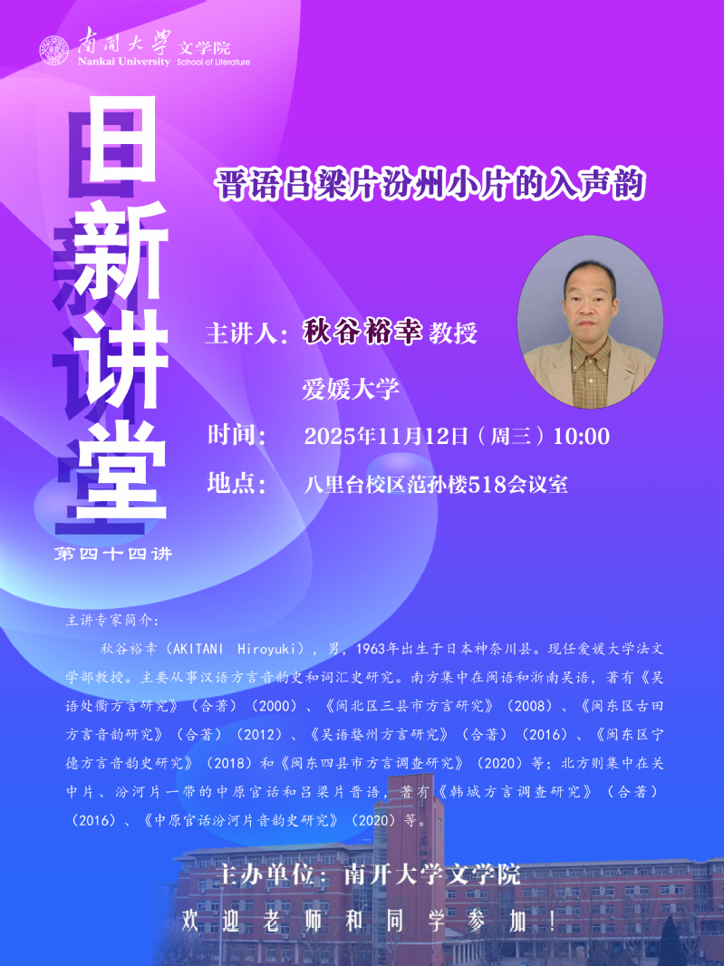 日新讲堂预告 | 秋谷裕幸教授:晋语昌梁片汾州小片的入声韵