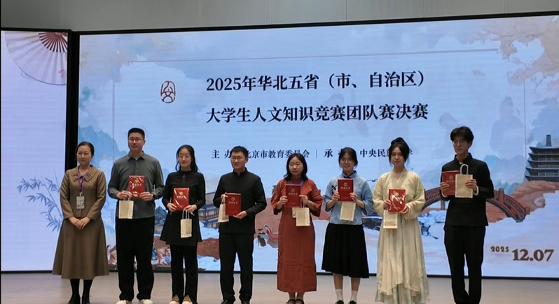 (通讯员:范昕婷 谢楠)12月7日,2025年华北五省(市、自治区)大学生人文知识竞赛团队赛总决赛于北京中央民族大学丰台校区圆满收官。我校代表队“青莲文心队”凭借全场最高分,荣膺一等奖第一名的佳绩。