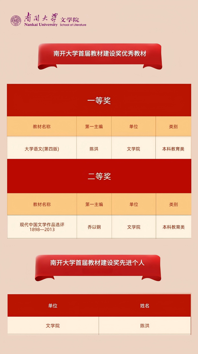 近日,南开大学首届教材建设奖评选工作圆满结束。经个人申报、单位推荐、专家评审及学校教材工作领导小组审议,我院《大学语文(第四版)》(陈洪教授主编)荣获优秀教材一等奖,《现代中国文学作品选评1898—2013》(乔以钢教授总主编)荣获优秀教材二等奖;陈洪教授荣获南开大学教材建设奖先进个人荣誉称号。